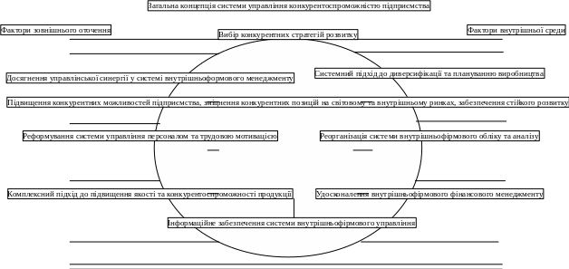 Управління конкурентоспроможністю сучасного машинобудівного підприємства пов’язує до одного цілого окремі елементи його организаційно-економічного механізму. Блок-схема такого управління приведена на рисунку 7.