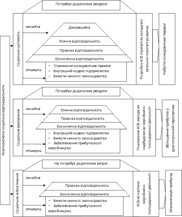 Фактично у цьому розширеному визначенні більшість зазначених напрямів діяльності бізнесу містять економічні принципи підприємницької діяльності, етичні та юридичні норми ведення бізнесу. Соціальна складова представлена в цьому визначенні через інвестиції в розвиток людського потенціалу і внесок у формування суспільства через партнерські програми і проекти розвитку місцевого співтовариства [9, c. 6].