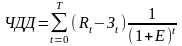 где: Rt – результаты, достигаемые на t-м шаге; Зt – затраты, осуществляемые на том же шаге; T – горизонт расчета, равный номеру шага расчета, на котором производится ликвидация объекта; (Rt-Зt) – эффект, достигаемый на t-м шаге; E – норма дисконта (в относительных единицах).