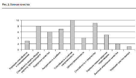 Респондентам была задана серия вопросов, связанных с темой этой статьи — поведенческой компетентностью по ICB; количество вопросов было сведено к минимуму, чтобы получить максимально полные ответы. Большинство из них относится к тем элементам компетентности, связанным с юмором, речь о которых шла выше. Целью исследования было выяснить, разделяют ли участники мнение, что юмор может использоваться в различных разделах поведенческой компетентности по ICB и считаться элементом «Глаза компетентности» IPMA. Всего в ходе исследования участникам нужно было ответить на 15 вопросов. Для 13 из них предлагались варианты ответов, два были открытыми. В ответе на последний вопрос участникам разрешалось выразить свою точку зрения на исследование в целом. Ответы респондентов были разделены в соответствии с профессиональным статусом последних на три категории: ответы менеджеров проектов, корпоративных управляющих и студентов, обучающихся по магистерской программе по управлению проектами в Университете Исландии. Опытные участники проектов также были отнесены к последней категории. Сначала нужно было указать свой пол, описать свою работу и дать определение юмора. Результаты ответа на вопрос о важных качествах менеджера проекта (четвертый) показали, что менеджеры проектов, участвовавшие в опросе, не ставят юмор на первые места, более того, фактически причиляют его к наименее важным качествам. На рис. 2 видно, что самым важным, согласно результатам опроса, участники считают способность к снятию напряженности. Респондентов попросили распределить различные качества по шкале от одного до десяти. Спокойствие, способность к снятию напряженности оказались одними из самых ценимых качеств, за ними следовал творческий подход, на третьем месте оказалась способность видеть общую картину происходящего.