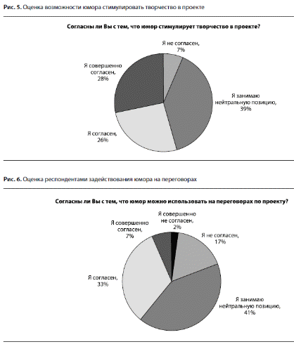 По результатам исследования самым важным качеством менеджера проекта была признана способность к снятию напряженности. Интересно увидеть разницу между мнениями менеджеров проектов и других участников. Менеджеры проектов могут испытывать потребность быть спокойными, быть способными лучше работать и контролировать свои проекты. Для других участников важнее, чтобы менеджер проектов видел общую картину происходящего, мог контролировать проекты и обладал творческим подходом к работе. При ответе на вопрос, является ли юмор важным качеством, 98% респондентов согласились с тем, что менеджер проектов должен уметь видеть во всем хорошее, чтобы помочь команде поддерживать оптимистичный настрой и таким образом увеличить шансы на достижение целей. 98% респондентов считают, что юмор может создавать хорошую рабочую атмосферу. Возможно, причина этого в следующем: участники полагают, что умение смеяться во время работы минимизирует напряжение и создает необходимую атмосферу для увеличения продуктивности, и менеджер проекта может этим воспользоваться. В ICB говорится, что юмор должен использоваться в проекте, и похоже, что участники исследования согласны с этой мыслью. Менеджер проекта может при помощи юмора сплотить команду, стимулировать к творчеству и создать более спокойную атмосферу. В одном из ответов участник написал, что юмор — это «способность смеяться над собой и таким образом способствовать созданию позитивного рабочего окружения». Смеясь и заставляя смеяться других, менеджер делает рабочую атмосферу менее давящей, что увеличивает шансы на успех проекта. Что касается напряжения и улучшения настроения команды проекта, менеджер может использовать юмор, чтобы люди чувствовали себя на работе спокойно. 92% участников согласились с этим утверждением. Во всех проектах возникают стрессовые ситуации, и способность видеть смешное может помочь преодолеть стресс, позволяя команде проекта погрузиться в то, что важнее всего, — выполнение требований проекта. Только 54% респондентов согласились с тем, что юмор стимулирует творчество в проекте. Возможно, причина этого в следующем: некоторые участники считают, что способность к творчеству или есть, или нет, и поэтому трудно помочь человеку творчески раскрыться. Чувство спокойствия и отсутствие напряжения позволяет создать условия, необходимые для стимулирования творчества членов команды, что важно для проектов. Сотрудники, которые могут творить во время работы на проекте, чувствуют себя более счастливыми, а юмор может отвлекать людей от проблем и таким образом стимулировать творчество. Респонденты также не пришли к согласию в вопросе о том, дает ли юмор преимущества на переговорах. Возможно, они считают, что юмор может негативно повлиять на этот процесс. Он должен использоваться с осторожностью, т.к. даже умное или смешное замечание может оказать противоположный эффект и убить все шансы на успех переговоров. Юмор может использоваться для мотивирования членов команды, т.к. благодаря ему команду можно сплотить, создать чувство единства и близости, необходимые людям для эффективной совместной работы. Юмор может использоваться в управлении конфликтами, так же как и на переговорах, и даже более эффективно, поскольку эмоционально в конфликтах люди раскрываются больше. Менеджер прое