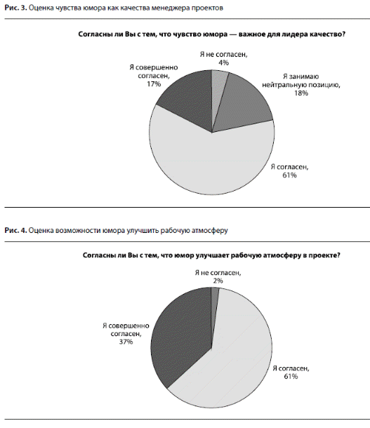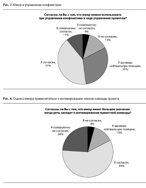 Затем исследование превратилось в сбор шуток о менеджерах проектов и выяснение у менеджеров, что они думают о собственном образе. Впоследствии исследование было сужено до рамок соответствия модели «Глаза компетентности» IPMA. После изучения поведенческой компетентности было решено выяснить, следует ли отнести к ней юмор. Имея на руках результаты исследований, подобные тем, которые получили мы, трудно не согласиться с тем, что менеджер проекта должен использовать юмор в ежедневной работе: в упражнениях, направленных на формирование команды, при ведении переговоров, демонстрации лидерских качеств и в итоге для достижения целей проекта. Менеджер проекта должен делать все, что в его силах, для того чтобы проектная команда чувствовала себя комфортно на рабочем месте. Если он может добиться этого, есть шанс, что команда действительно будет работать лучше и превысит ожидания, вследствие чего менеджер проекта также будет чувствовать себя хорошо.