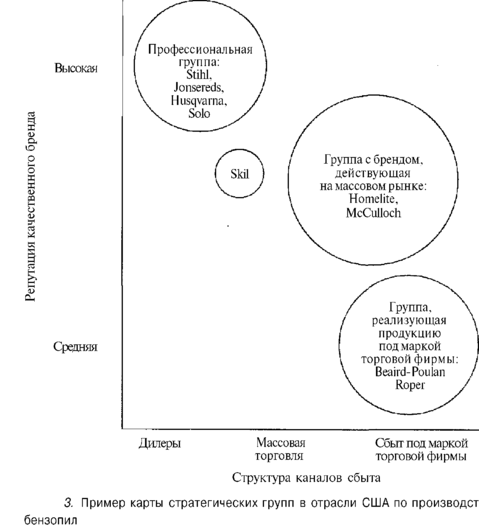 При составлении карты стратегических групп аналитик должен выбрать основные стратегические параметры, чтобы использовать их в качестве осей координат. При этом следует руководствоваться определенными принципами. Во-первых, роль осей наилучшим образом выполняют параметры, определяющие ключевые барьеры мобильности в отрасли. Например, в производстве безалкогольных напитков основными барьерами являются узнаваемость брендов и каналы сбыта, которые и следует выбирать при составлении карты. Во-вторых, при картографировании групп в качестве осей координат не следует выбирать параметры, которые изменяются пропорционально друг другу. Например, если все фирмы, характеризуемые высокой дифференциацией продукта, имеют также широкую производственную специализацию, оба эти параметра не должны служить в качестве осей. Следует выбирать параметры, отражающие разнообразие компонентов стратегии в отрасли. В-третьих, выбираемые параметры могут не носить характер непрерывных или монотонных переменных. Например, в отрасли по производству бензопил целевыми каналами сбыта являются дилеры, выполняющие также функции обслуживания, предприятия массовой торговли и продавцы, сбывающие продукцию под маркой торговой фирмы. Некоторые фирмы делают упор на один из каналов, другие стремятся расширить их разнообразие. С точки зрения стратегии в наибольшей степени отличается сбыт через обслуживающих дилеров и под маркой торговой фирмы, а предприятия массовой торговли занимают промежуточное положение. При составлении карты этой отрасли, возможно, наилучшую картину отрасли дает расположение фирм, представленное на рис. 7.3 и отражающее состав их каналов сбыта. Наконец, еще одним принципом является возможность картографирования отрасли несколько раз с использованием различных комбинаций стратегических параметров, что позволяет аналитику увидеть ключевые проблемы конкуренции. Задача картографирования заключается в том, чтобы помочь в диагностировании конкурентных отношений, поэтому подходы к нему могут быть различны.