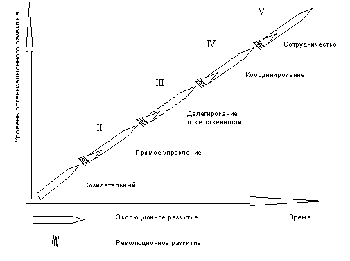 Организация также последовательно проходит все стадии своего развития. При этом эффективный переход к следующему этапу возможен в случае преодоления всех проблем предыдущего этапа.