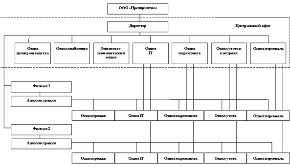 Представленная на схеме 1 организационная структура предприятия напоминает матричную структуру с двойным (линейным и функциональным) подчинением. На самом деле это псевдоматричная структура, так как филиалы являются территориально удаленными подразделениями, имеющими сложную систему коммуникаций с центральным офисом, централизованные снабжение, планирование, распределение ресурсов и контроль. По этим же причинам и двойному подчинению, филиалы нельзя отнести к автономным бизнес-единицам. Отличие, в свою очередь, от дивизиональной структуры, для которой характерно централизованное распределение ресурсов и контроль, заключается в том, что часть вопросов, связанных с оперативной деятельностью филиала решаются без привлечения его руководителя - центральным офисом и функциональными специалистами филиала, тем самым ограничивая полномочия руководителя.
