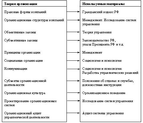 Организацией как объектом исследования занимаются менеджмент, экономика, социология, психология, политология и другие науки. Каждая из этих дисциплин рассматривает лишь часть процессов, происходящих в организации. Так, менеджмент рассматривает вопросы, связанные с элементами организации и процесса управления, коммуникациями, с организацией взаимодействия и полномочий, построения организаций. Экономика изучает элементы организации и оплаты труда; организации производства; экономические законы развития, в том числе пропорционального и планомерного развития, соответствия производственных отношений характеру производительных сил. Психология изучает психическое отражение человеком различных аспектов организационных отношений. Политология рассматривает отношение людей к политическим организациям, проблемам внутренней и внешней политики. Однако это лишь элементы, составляющие организацию в целом как процесс и как явление. Предпринимались попытки объединить усилия перечисленных наук в области исследования организаций как больших систем посредством кибернетики, теории управления. Так, теория управления изучает следующие проблемы, касающиеся организации: производство как система, типы отношений управления, организационная структура управления, линейные и функциональные связи, организационно-распорядительные методы управления, организация процесса управления, организация управленческого труда. Дальнейшее развитие исследований в области теории управления способствовало выделению теории организации как самостоятельной новой науки. Она призвана интегрированно подходить к ключевым процессам, происходящим в формальных и неформальных объединениях людей и их коммуникациях.