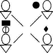 3) Совместно-индивидуальный тип деятельности отличается тем, что взаимодействие между участниками труда минимизируется (рис. 5.7). Каждый из исполнителей выполняет свой объем работы, специфика деятельности задается индивидуальными особенностями и профессиональной позицией каждого. Каждый из участников процесса представляет результат труда в оговоренном виде и в определенное место. Личное непосредственное взаимодействие может практически отсутствовать и осуществляться в непрямых формах (например, через телефон, компьютерные сети и т.д.). Объединяет разных исполнителей лишь предмет труда, который каждый из участников обрабатывает специфическим образом. Примеры этого типа деятельности — индивидуальная переноска тяжестей или независимый анализ различных аспектов одного и того же явления разными специалистами.
