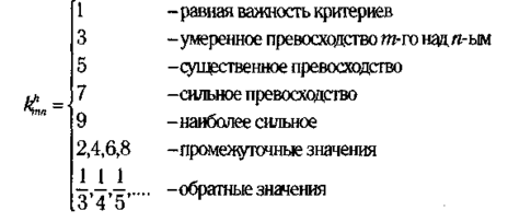 Матрицы С2,..., Сh (сравнение альтернатив по критериям 2, …, h) составляются аналогично. Элементы матриц определяются путем экспертного попарного сравнения альтернатив друг с другом по каждому критерию. Тогда элементы kh mn будут иметь следующие значения: Л