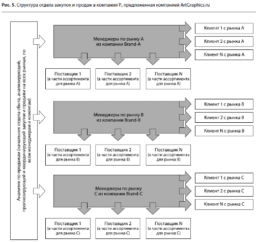 Мы подумали, что компании P. нет смысла быть одним из операторов (поставщиков) на своем рынке. Потребители очень мало интересовались ею, они интересовались исключительно своим собственным бизнесом и относились к продукции P. как к коммодити со всеми вытекающими отсюда последствиями. Р. старалась делать свое дело на совесть и постоянно искала новых поставщиков на Западе и Востоке, предлагая своим клиентам высококачественную продукцию по умеренным ценам. Однако в результате экономического кризиса курс гривны настолько сильно снизился по отношению к свободно конвертируемым валютам, что это сделало большую часть продукции Р. неконкурентоспособной. Кроме того, имеется тенденция выхода крупнейших поставщиков такой продукции на рынки развивающихся стран, минуя посредников-дистрибьюторов, таких как Р. Мы посоветовали руководству Р. перестать «раскручивать» чужие товарные бренды, а «раскрутить» свой, корпоративный отдельно на каждом критически важном рынке. Чтобы не приходилось посылать всем гигантские прайслисты и каталоги, из которых каждого отдельно взятого клиента интересовали только 5–10% ассортиментных позиций. По нашей задумке Р. должна была создать систему суббрендов, которые могли быть виртуальными компаниями на базе созданных отраслевых отделов, при этом за счет централизации была бы достигнута экономия на логистике, бухгалтерии, финансовом менеджменте, кадрах, IT и других ключевых департаментах. Фактически в рамках каждой из вновь создаваемых компаний / суббрендов нужно было создать только свой отдел продаж, закупок и посадить между ними одного аналитика, который мог бы координировать закупки и продажи. Роль такого аналитика – начальника отдела сбыта была хорошо знакома мне по работе в концерне «Видеосервис», в котором я в свое время занимался анализом, прогнозированием и управлением продажами продукции кинокомпаний Columbia Tristar, Buena Vista и Walt Disney по всей территории России.