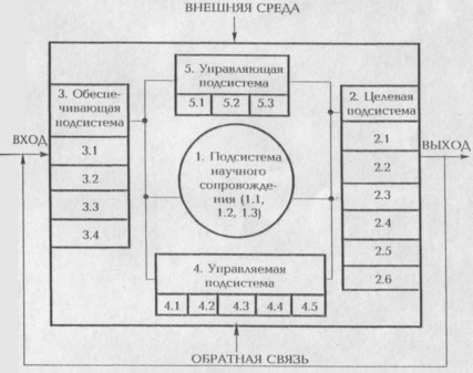 Перечисленные 5 подсистем системы менеджмента составляют ее внутреннюю структуру. Внешнее окружение системы менеджмента организации включает следующие компоненты: внешняя среда, вход, выход, обратная связь.