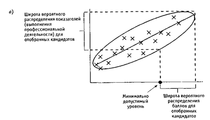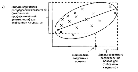 Общие методы статистического регрессионного анализа могут использоваться в тех ситуациях отбора, где на основе применяемой процедуры отбора (или нескольких процедур) получают одну опенку в баллах или более. Диаграмма рассеяния, представленная на рис. 3, показывает результаты, полученные уже работающими сотрудниками, по тесту на пространственное мышление и оценку их профессиональной деятельности непосредственными руководителями. Линейно-регрессионный анализ дает возможность статистически определить линию наибольшего соответствия, которая также показана на рисунке.