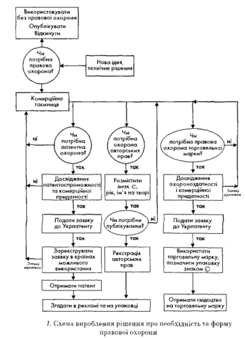 Схему вироблення рішення про правову охорону результатів досліджень і розробок у загальному вигляді показано на рис. 3.1. Тут досягаються дві важливі цілі. По-перше, схема забезпечує системний підхід до кожної ситуації, пов'язаної з інтелектуальною власністю. По-друге, вона гарантує розгляд усіх типів інтелектуальної власності для кожної ситуації.