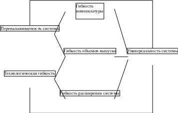 На рисунке 1 переналаживаемость системы показывает время и стоимость перехода на изготовление очередного наименования деталей в рамках заданной номенклатуры, гибкость номенклатуры характеризует способность производственной системы к обновлению продукции, технологическая гибкость отражает способность системы использовать различные варианты технологических решений при формировании процесса изготовления изделий, гибкость объемов выпуска демонстрирует способность системы экономично изготавливать детали при различных размерах партий запуска, гибкость расширения системы есть совокупность возможностей поэтапного ее создания и последующего расширения с учетом возможности объединения нескольких систем в единый комплекс, универсальность системы характеризуется множеством деталей, которые могут быть потенциально обработаны в ГПС.
