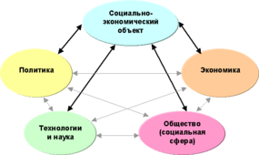 В этой системе есть детерминирующие связи, направленные с нижних уровней иерархии системы к верхним (наука и технология влияет на экономику, экономика влияет на политику), а также обратные и межуровневые связи. Изменение любого из факторов через эту систему связей может влиять на все остальные.