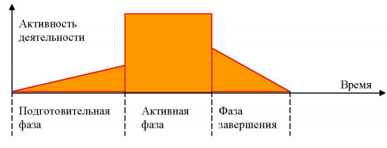Любой процесс, применяемый в жизненном цикле программной системы, продолжителен во времени. Структурно он может состоять из трех фаз, как показано на рисунке 3.