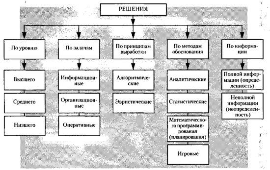По решаемым задачам различают информационные, организационные и оперативные решения. Информационные решения имеют целью оценить получаемую информацию, ответить на вопрос: «Что правда?» Организационные решения призваны установить необходимую структуру управления, ответить на вопрос: «Каким быть?» Оперативные решения есть решения на действия: «Как действовать?»