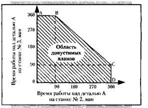 Обоснованием такого оптимального решения занимается математическое программирование. Суть метода удобнее всего выразить с помощью наглядного геометрического представления, графика (рис. 3). Здесь показан построенный по правилам математического программирования многоугольник OABCD (он заштрихован). Многоугольник соответствует условиям нашей задачи и представляет собой область допустимых планов распределения времени работы станков № 2 и № 3 над деталью А. По соответствующим осям графика отмечена продолжительность работы этих станков. (В своих расчетах мы вполне можем обойтись двумя станками и одной деталью, так как по этим данным нетрудно рассчитать и все остальные.)