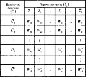 Элементами матрицы являются значения показателя эффективности, рассчитанные для сочетания параметра решения и параметра среды соответственно данной клетке матрицы. Так, элемент, записанный на пересечении j-го столбца и i-й строки матрицы, соответствует значению показателя эффективности, рассчитанному для значений параметров Ui и Zj.