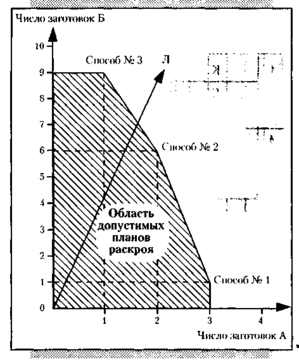 Для составления оптимального плана раскроя материала построим график, подобный тому, который мы рисовали в задаче со станками. На рис. 5 по оси X отложено количество заготовок А, а по оси Y – число заготовок Б. При этом каждому способу раскроя соответствует своя точка на графике. Так, точка «способ № 2» стоит на пересечении двух заготовок А и шести заготовок Б. Точки – способы раскроя – указывают границы области допустимых планов.