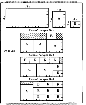 Прежде всего, нужно установить все возможные способы раскроя наших листов по требуемым заготовкам. Начнем с того, что постараемся получить с одного листа как можно больше заготовок А – они крупнее, чем Б, и для них труднее подыскать место на листе. Оказывается, однако, что более трех заготовок А с листа выкроить невозможно. Исходя из этого предусмотрим способы раскроя для получения трех, двух и одной заготовки А и наибольшего возможного количества заготовок Б с листа. Каждому способу дадим номер: