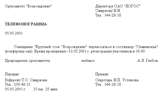 Телефонограмма - включает следующие реквизиты: наименование организации, вид документа, адресат, дата, индекс, текст, подпись, отметки о времени передачи и указание должности и фамилий (или только фамилий) лиц, принявших и передавших телефонограмму. В случае отсутствия бланков для телефонограмм, применяются листы бумаги формата А5 (или журнал). Телефонограммы составляются в одном экземпляре, подписываются руководителем или непосредственным исполнителем. Текст телефонограммы не должен включать более 50 слов. Если телефонограмма передается нескольким адресатам, то прилагается список учреждения-адресатов и номеров телефонов. (Рис.3)