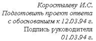 Указания по использованию полученного письма фиксируются в форме РЕЗОЛЮЦИИ, включающей фамилию и инициалы исполнителя, содержащие поручения и срок исполнения. Резолюция обязательно датируется и подписывается. (рис.2)