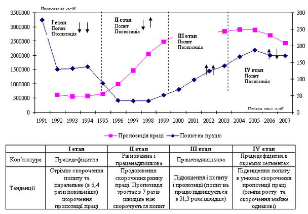 На основі класифікації етапів розвитку ринку праці за динамікою попиту та пропозиції проаналізовано розвиток національного ринку праці за часи незалежності (рис. 1). Для одночасного аналізу напрямів впливу демографічних та міграційних тенденцій на ринок праці України автором розроблена матриця оцінки формування трудового потенціалу національного ринку праці (рис. 2), в результаті використання якої в еволюції відносин формування сукупної пропозиції праці стає можливим виділення наступних етапів: 1) 1991-1992 рр. - збільшення сукупної пропозиції праці як за рахунок корінного населення, так і іноземців; 2) 1993-2004 рр. - скорочення сукупної пропозиції праці як за рахунок демографічних тенденцій, так і міграції населення; 3) 2005-2008 рр. - поступове «заміщення» корінного населення іноземним в результаті скорочення кількості корінного населення одночасно із збільшенням іноземного (з 2005 р. міграційне сальдо України змінило знак з негативного на позитивний). Негативним моментом (крім соціальних, ментальних, культурних, психологічних) є нерівноцінність «заміщення» високоосвіченого населення на мігрантів переважно з низьким рівнем освіти і без кваліфікації, що приїздять для роботи переважно у сфері торгівлі імпортованими товарами та не беруть участь у розвитку національної економіки. Обґрунтовано необхідність включення даної матриці до системи оцінки національної безпеки України.