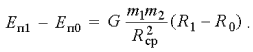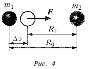 Можно вывести общую формулу потенциальной энергии гравитационного взаимодействия тел (но не просить учеников воспроизводить этот вывод, хотя окончательную формулу они, конечно, должны знать). Например, рассмотрим два точечных неподвижных тела массами m1 и m2 , расположенные на расстоянии R0 друг от друга (рис. 4). Обозначим энергию гравитационного взаимодействия этих тел через Еп0. Предположим далее, что тела немного сблизились до расстояния R1. Энергия взаимодействия этих тел стала Еп1. Согласно закону сохранения энергии: