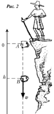 Рассмотрим падение камня со скалы (рис. 2). Необходимо определить, как изменяется кинетическая энергия Ек камня и потенциальная энергия Еп его взаимодействия с Землей по мере падения. Предположим, что на краю скалы (точка А) скорость камня равна нулю.