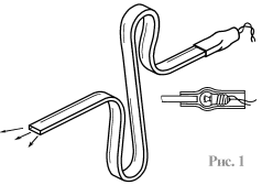 Внешний вид учебного световода в работе и способ крепления источника света показаны на рис.1. Из листа оргстекла толщиной 4 мм резаком вырежьте две полоски длиной примерно 50 см и шириной 10 мм. Торцы и узкие боковые поверхности полосок отшлифуйте последовательно все более мелкой шкуркой. Грубую ткань или кусок войлока слегка смочите керосином и натрите полировальной пастой ГОИ и обработайте им сначала торцы обеих полосок, а затем - боковые поверхности одной из них. Полировать нужно до тех пор, пока обрабатываемые поверхности не станут совершенно прозрачными.