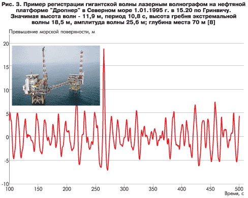Именно благодаря наблюдениям с нефтяной платформы удалось получить первые точные измерения волны-убийцы — знаменитой волны «Дропнер», или «Новогодней волны» [7,8]. Измерения волнения производились на нефтедобывающей платформе «Дропнер» компании Statoil в Северном море с помощью стандартного лазерного волномера, измерявшего колебания уровня моря с частотой 2,33 Гц; 20-минутный фрагмент записи показан на рис. 3. Волномер был установлен на необитаемой вспомогательной вышке, соединенной мостом с обитаемой частью платформы (рис. 3, врезка).