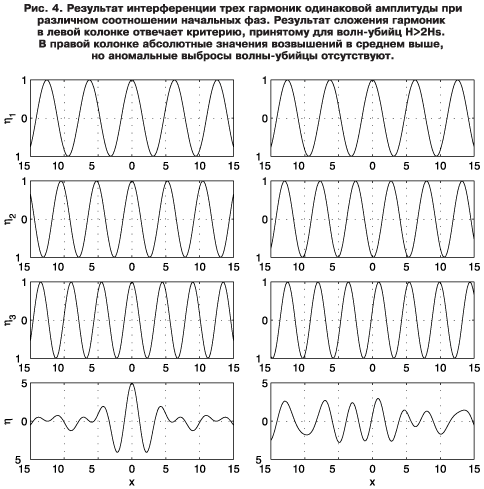 Поэтому гребни волн с различными периодами (длинами), распространяясь с разными скоростями, могут совпасть в определенный момент в некоторой точке пространства и дать, в принципе, сколь угодно большой всплеск (рис. 4). Вероятность такого события ничтожно мала и очень сильно зависит от некоторого начального распределения амплитуд (энергий) отдельных волновых компонент. Именно с помощью задания граничных условий определенного вида такая волна-убийца может быть легко получена в лабораторных условиях — частота волнопродуктора уменьшается по специальному закону таким образом, чтобы быстрые низкочастотные волны догнали высокочастотные относительно медленные волны в нужной точке — точке фокусировки [12]. Максимальная высота волны в точке фокусировки в рамках линейной теории ничем не ограничена, ограничения связаны с нелинейными процессами, в частности с обрушением достаточно крутых волн.