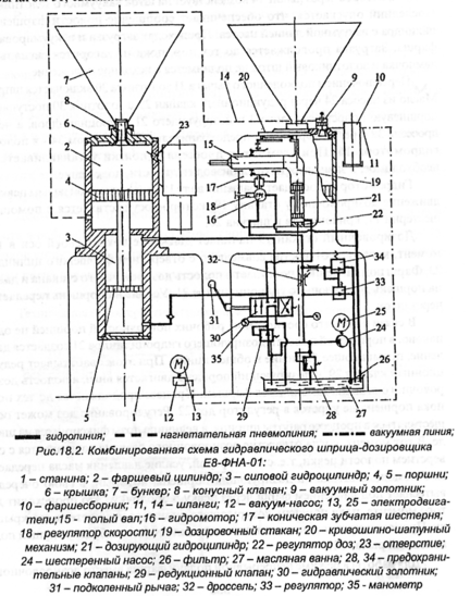 В связи с тем, что соотношение рабочих поверхностей поршней не одинаково, в поршневой полости дозирующего гидроцилиндра 21создается давление, повышающее давление в общей линии. При этом срабатывает редукционный клапан 29, и дозирующий поршень двигается вниз, а полость дозировочного стакана заполняется фаршем. Процесс продолжается до тех пор, пока поршень не упрется в регулятор доз 22. Регулирование доз может осуществляется в процессе работы шприца, а величина дозы фиксируется на шкале. В тот момент, когда отверстие дозировочного стакана совмещается с отверстием полости цевки, усилие давления масла передается с помощью штока на дозирующий поршень, который, в свою очередь, вытесняет под давлением фарш через цевку в оболочку. Это происходит до того момента, пока поршень дозирующего цилиндра не упрется в его крышку.
