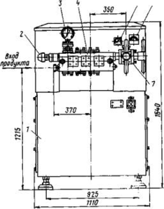 Габаритный чертеж гомогенизатора марки А1-ОГМ: 1 - станина; 2 - предохранительный клапан; 3 - манометрическая головка; 4 - плунжерный блок; 5 - манометр системы смазки; В - амперметр; 7 - гомогенизирующая головка