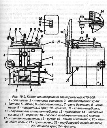 Котел пищеварочный электрический КПЭ-100 представляет собой варочный сосуд с двумя стенками. Котел имеет облицовку, выполненную из листов эмалированной стали. Пространство между внешней стенкой и облицовкой заполнено тепловой изоляцией. В нижней части смонтирован парогенератор, выполненный в виде прямоугольной стальной коробки с вмонтированными в ней 6 тенами. Пространство между двумя стенками котла представляют собой герметичную пароводяную рубашку.
