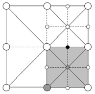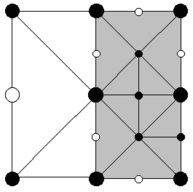 Рис 6. Пример меша. Включенные вершины помечены черным. Серые треугольники отрисованы во время рекурсивного вызова Render() для сопоставленных им подквадратов. Белые треугольники отрисоввываются во время изначального вызова Render() для этого квадрата.