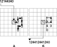 Для того, чтобы в общих чертах представить себе, как это может происходить, рассмотрим следующую алгоритмическую модель. В начале сгенерируем случайную последовательность какой-то произвольной длины n, состоящую из нерегулярно чередующихся четырех знаков (обозначим их - 1,2,3,4). Например, 1214434. В конце последовательности запишем ноль как признак завершения кода. Затем разместим эту последовательность на клеточном поле по следующим правилам (см. рисунок а).