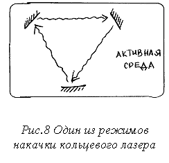 Примером оптической системы, в которой наблюдался стохастический резонанс, служит так называемый кольцевой лазер (рис.8), в котором лазерный свет накачивается в резонаторе с тремя или более зеркалами. В этой системе существует два стабильных режима накачки лазерного света, когда свет движется по или против часовой стрелки. Экспериментаторы модулировали параметры накачки в этих двух режимах и наблюдали стохастический резонанс в выходящем лазерном свете. Это был один из первых экспериментов (1988 год), когда стохастический резонанс наблюдался в лаборатории.