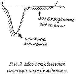Стохастический резонанс в иных системах. До этого речь шла исключительно о бистабильных системах. Однако недавно было осознано, что это явление - совершенно общего плана, и оно может возникать и в системах, отличных от бистабильных. Главное требование - это наличие какого-либо порога. Примером такой системы может служить потенциал, изображенный на рис.9. В этом случае перескоки происходят не между двумя устойчивыми положениями равновесия, а между "основным" и "возбужденным" состояниями системы.