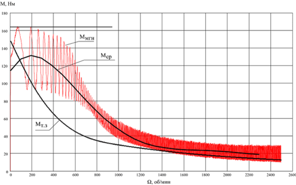 Рис.10 Зависимость мгновенного (Ммнг), среднего (Мср) и заданного (Мт.з) момента двигателя от скорости