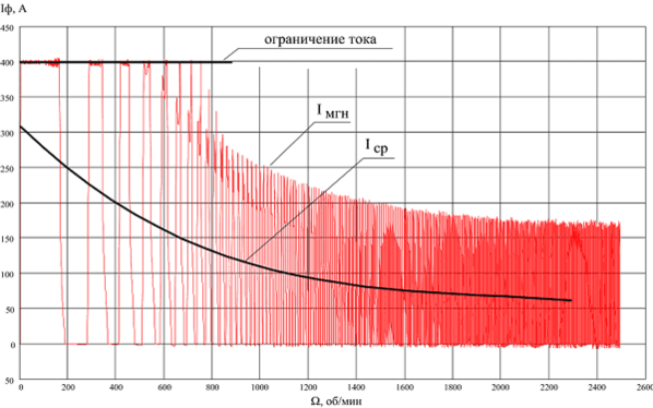 Рис. 9 Зависимость мгновенного (Iмгн) и среднего(Iср) значения потребляемого тока фазы от скорости