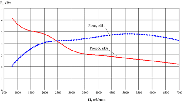 При снижении скорости ниже критической скорости, генератор не способен обеспечить выходную мощность даже при высокой мощности возбуждения, что вызвано низким значением ЭДС генератора. Ниже скорости вращения 2000 об/мин мощность генератора становиться менее заданных 4 кВт (рис.13). Таким образом, преобразователь частоты и генератор необходимо проектировать с учетом того, что проходная мощность может в несколько раз превышать номинальную мощность генератора, если он предназначен для эксплуатации на низких скоростях вращения.