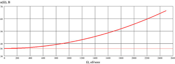 С ростом скорости вращения, ЭДС генератора, вызванная перемещением зубцов ротора относительно зубцов статора, возрастает пропорционально скорости вращения. Требуемая мощность возбуждения при этом уменьшается.