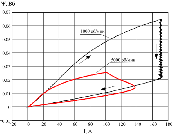 На средних скоростях вращения ЭДС генератора вызывает нарастание тока фазы после прекращения возбуждения (точке окончания возбуждения соответствует точка с током 100А рис.12). На рис. 12 представлена энергетическая диаграмма для скорости вращения 5000 об/мин и, для сравнения, для скорости 1000 об/мин. Возбуждение при этом производится до значений тока, значительно меньшего, чем при низких скоростях. Стрелками показано направление изменения потокосцепления в течение цикла коммутации фазы. Энергетическая диаграмма позволяет также определить среднее значение момента, который пропорционален площади, охватываемой годографом ,I.