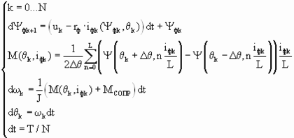 Математическая модель строится на совместном интегрировании уравнений напряжения электрической цепи для всех фаз и уравнения движения: