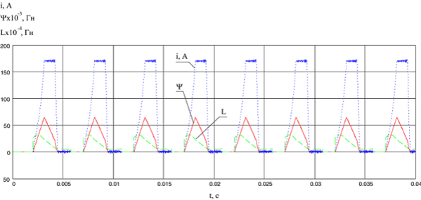 Рис.11 Зависимость тока, потокосцепления и индуктивности фазы от времени (1000 об/мин 4кВт)