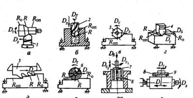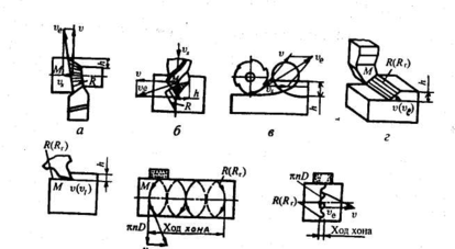 а – точение; б – сверление; в – фрезерование; г – строгание; д – протягивание; е – шлифование; ж – хонингование; з – суперфиниширование; Dr – главное движение резания; Ds – движение подачи; Ro – обрабатываемая поверхность; R – поверхность резания; Rоп – обработанная поверхность; 1 – токарный резец; 2 – сверло; 3 – фреза; 4 – строгальный резец; 5 – протяжка; 6 – абразивный круг; 7 – хон; 8 – бруски; 9 – головка.