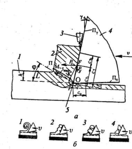 а – 1 – обрабатываемый материал; 2 – стружка; 3 – подача смазочно-охлаждающих средств; 4 – режущий клин; 5 – режущая кромка; φ – угол сдвига, характеризующий положение условной плоскости сдвига (П) относительно плоскости резания; γ – главный передний угол режущего клина; Рz – сила резания; Рy – сила нормального давления инструмента на материал; Сγu, Сγl – длины пластичного и упругого контактов; Сγ, Сa – длина зон контактного взаимодействия по передней и задней поверхностям инструмента; LOM – область главного упругопластичного деформирования при стружкообразовании; FKPT – область вторичной контактной упруго–пластичнеской деформации металла; h – глубина резания; Н – толщина зоны пластического деформирования (наклепа) металла.