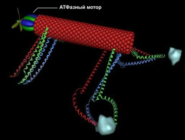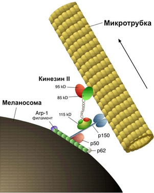 Рис. 5. Перемещение кинезином меланосомы (клеточной органеллы) вдоль микротрубки