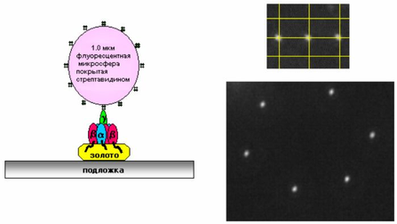 При добавлении к набору получившихся наномоторов 2 мM Na2ATФ и при присутствии в растворе 4 мM MgCl2 дифференциальным интерферометром наблюдалось вращение микросферы, составляющее 9.5-10.5 Гц, или 3-4 об/сек. Причем вращение представляло собой дискретные изменения угла, образованного γ-субъединицей и α3β3 - комплексом, каждый раз на 120°.